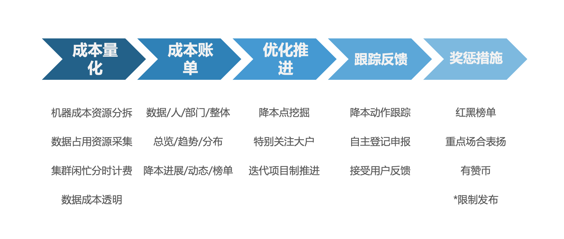 我们会把消耗的成本以一个成本账单的形式记录下来,记录的维度可以是数据的维度也可以是人、团队或者整个数据平台的维度,我们下一步是发展到整个业务端,跟业务一起联动,但目前还只是在数据中台内部,没有跨到业务当中去。