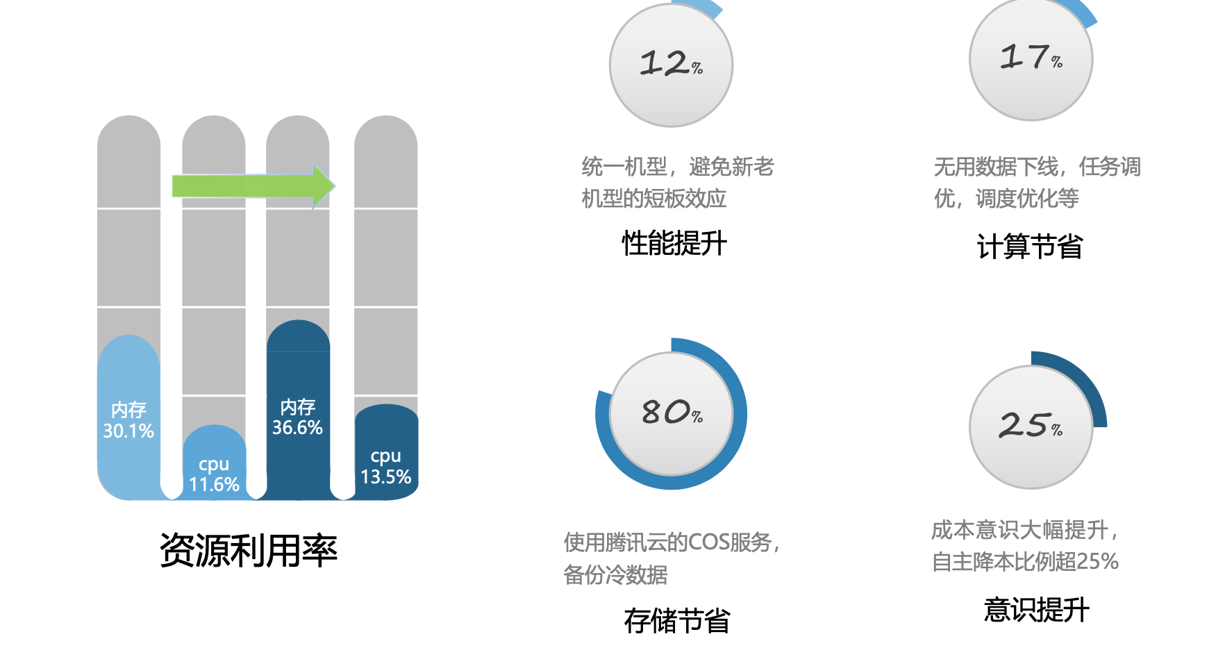 从数据上来看,通过统一机型的方式,整体的计算性能提升了 12% ;通过将无用数据下线、任务调优后计算节省了 17% ;通过使用腾讯云的 COS 服务备份冷数据,存储成本下降了 80% ;通过提成升本意识,自主降本的比例超过了 25% ,通过这样变成了一个良性循环。