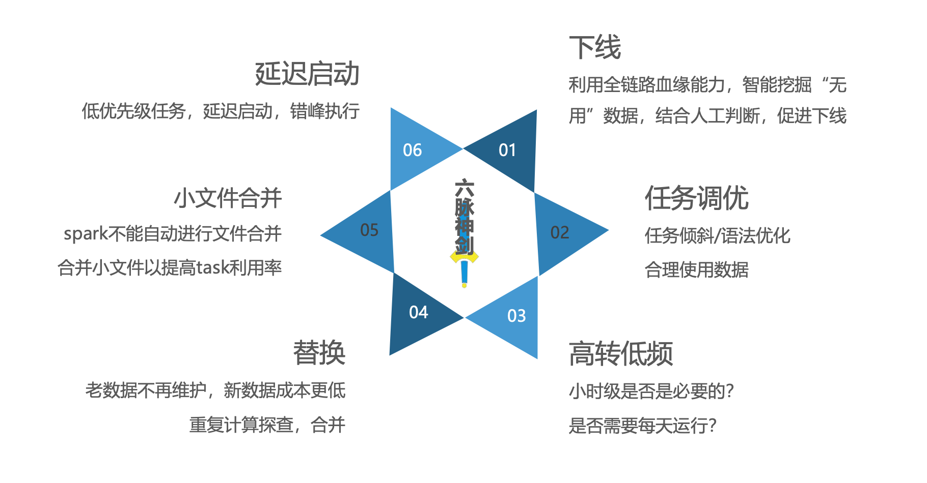 第一部分是把一些无用的数据下线。这块是利用全链路的数据资产和血缘关系,进行智能挖掘,特别是上游应用场景中已经不再使用或者使用频率非常低的数据,再结合人工的判断促进下线。