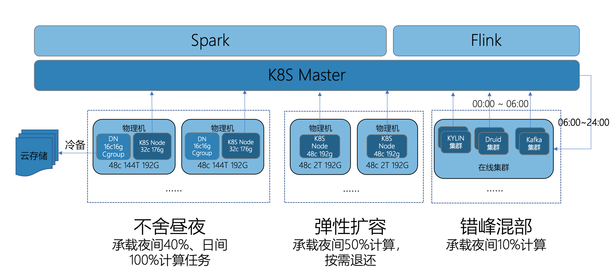 通过容器化,也可以很方便的实现存储与计算分离。一般而言,用来完成在线服务的资源,在夜间的利用率是非常低的,这部分计算资源是可以在夜间加入到容器中,为夜间跑批提供更多的资源,优点非常多。