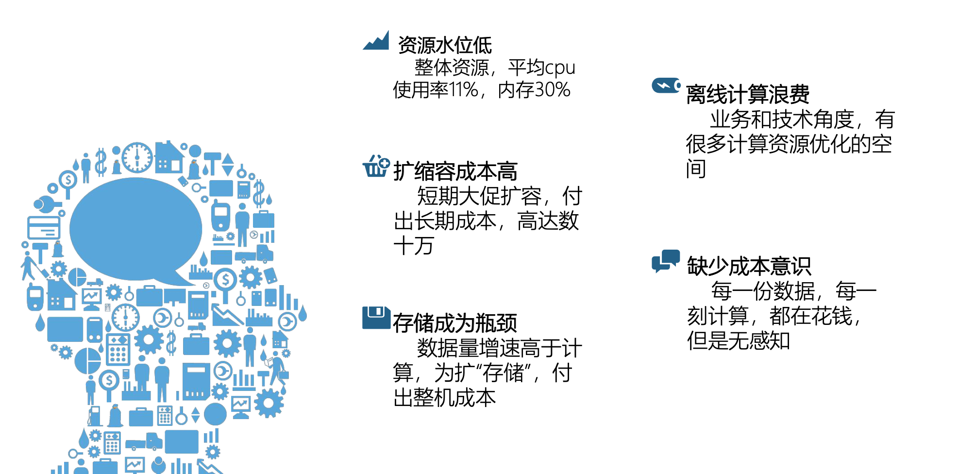 根据目前的业务情况来看,数据中台资源上投入成本的增速比我们整个业务发展的增速还要快,这就导致了它的不可持续性,这也是我们进行成本治理的一个主要原因。
