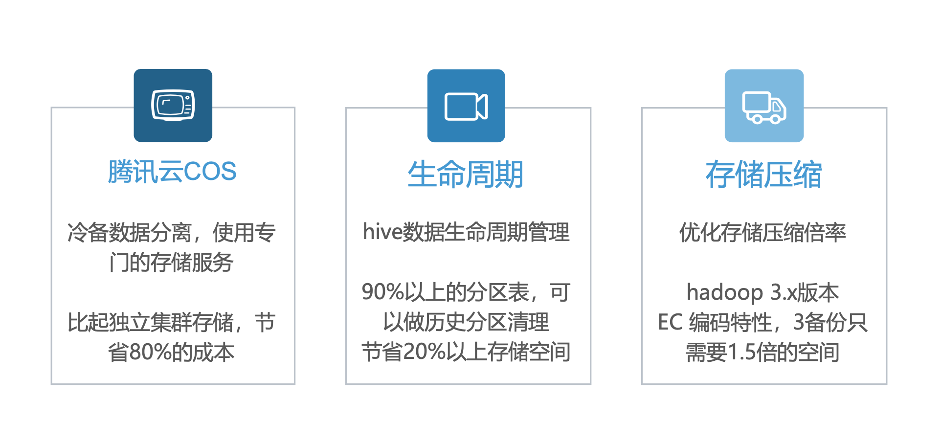 第一是冷备的数据。冷备的数据主要针对不可恢复数据的存储。这一块我们是用一个专门的机器来做,现在基本上把这部分的内容都存到了腾讯的 COS 上,成本降低非常大。COS 给了我们一个很好的折扣,比起之前冷数据的独立集群存储,降低了大概 80% 的成本。而且放到 COS 上也比放在自己的服务器上安全性高了很多。