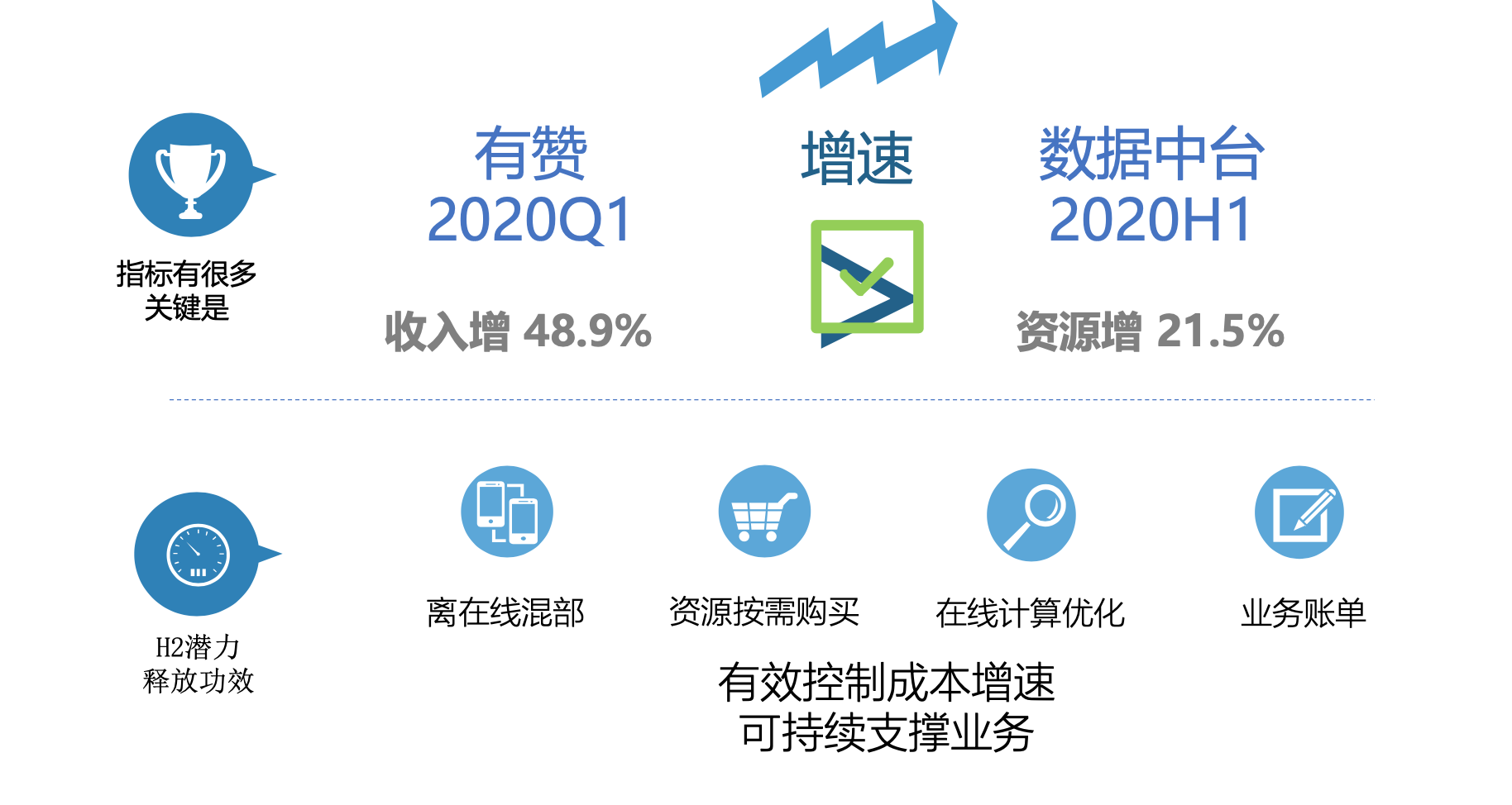 最后从整体资源的情况来看, 2020 年 Q1 有赞整体收入的增加是非常快的,增加了 50% 左右,但数据中台在整个 H1 的资源只增加了 21.5% 。这跟 2019 年下半年的情况是完全相反的。