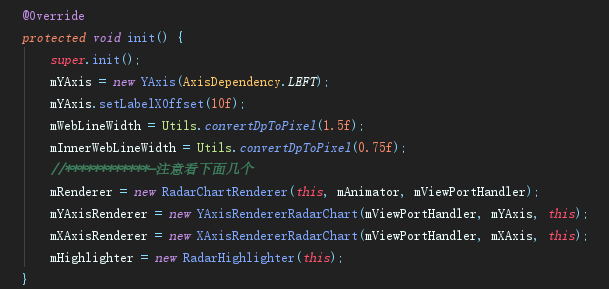 从RadarChart类中我们可以看到init()方法中的内容,可以看出来自定义了绘制类。仅从字面我们就可以看出RadarChartRenderer是绘制雷达的,YAxisRendererRadarChart和XAxisRendererRadarChart是绘制x轴/y轴相关内容的,既然这样那我们就清楚了,进RadarChartRenderer看看里面的实现;