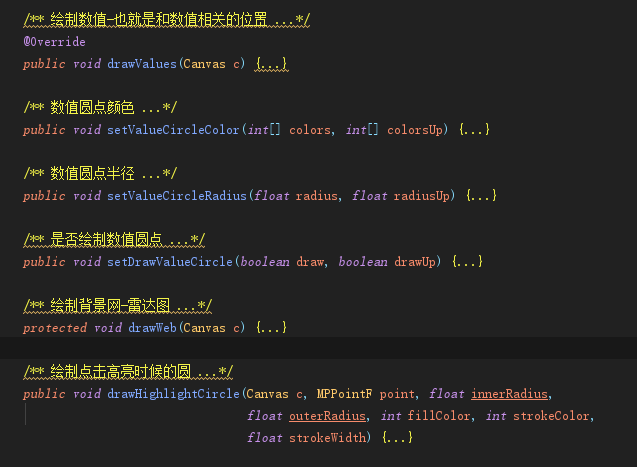 直接贴代码,很基础的绘制代码,就不做介绍了。代码过长,没必要的就直接用省略号了,对比下RadarChartRenderer即可