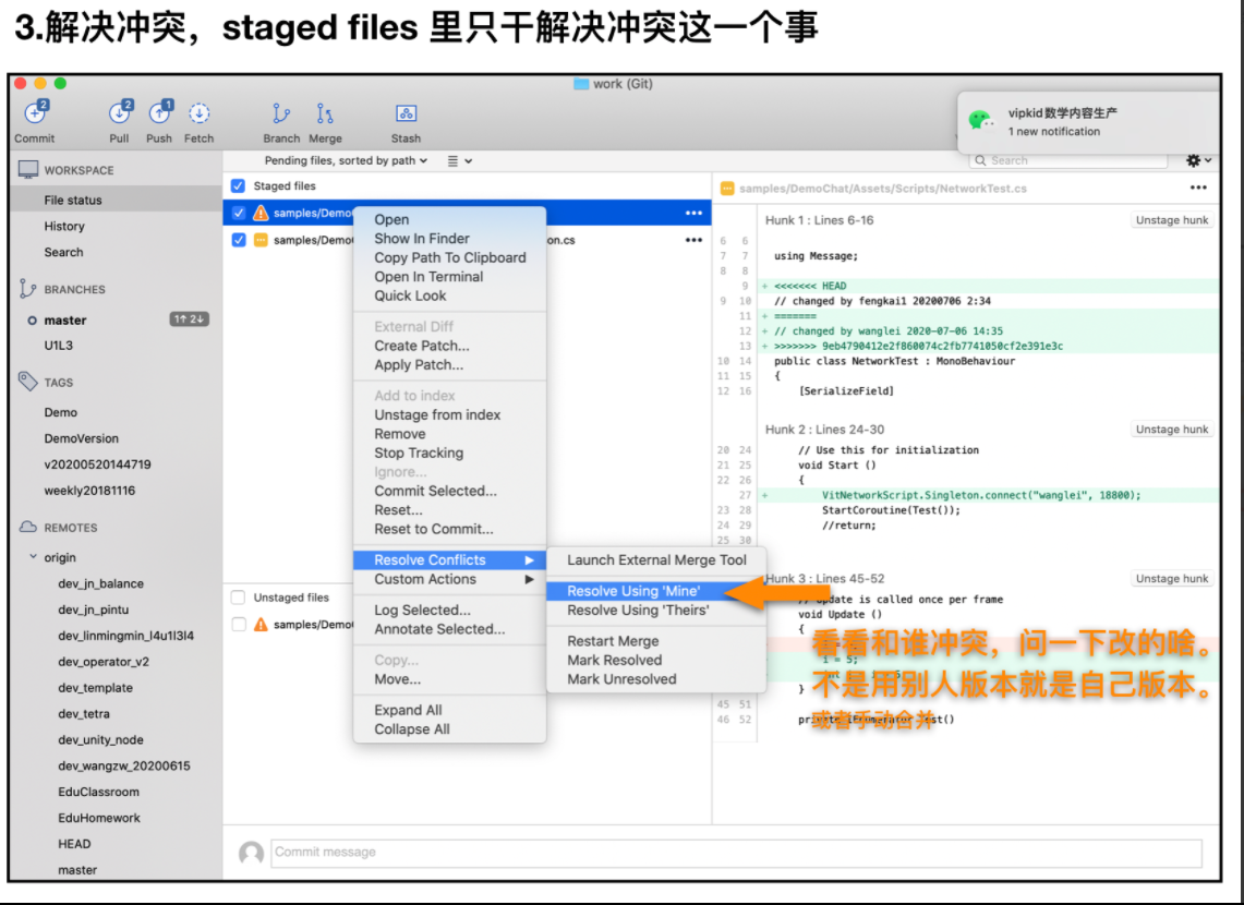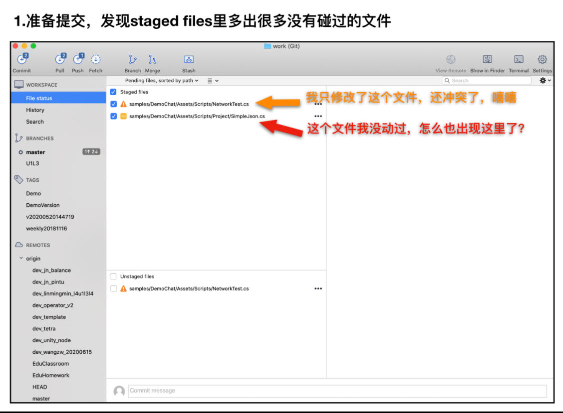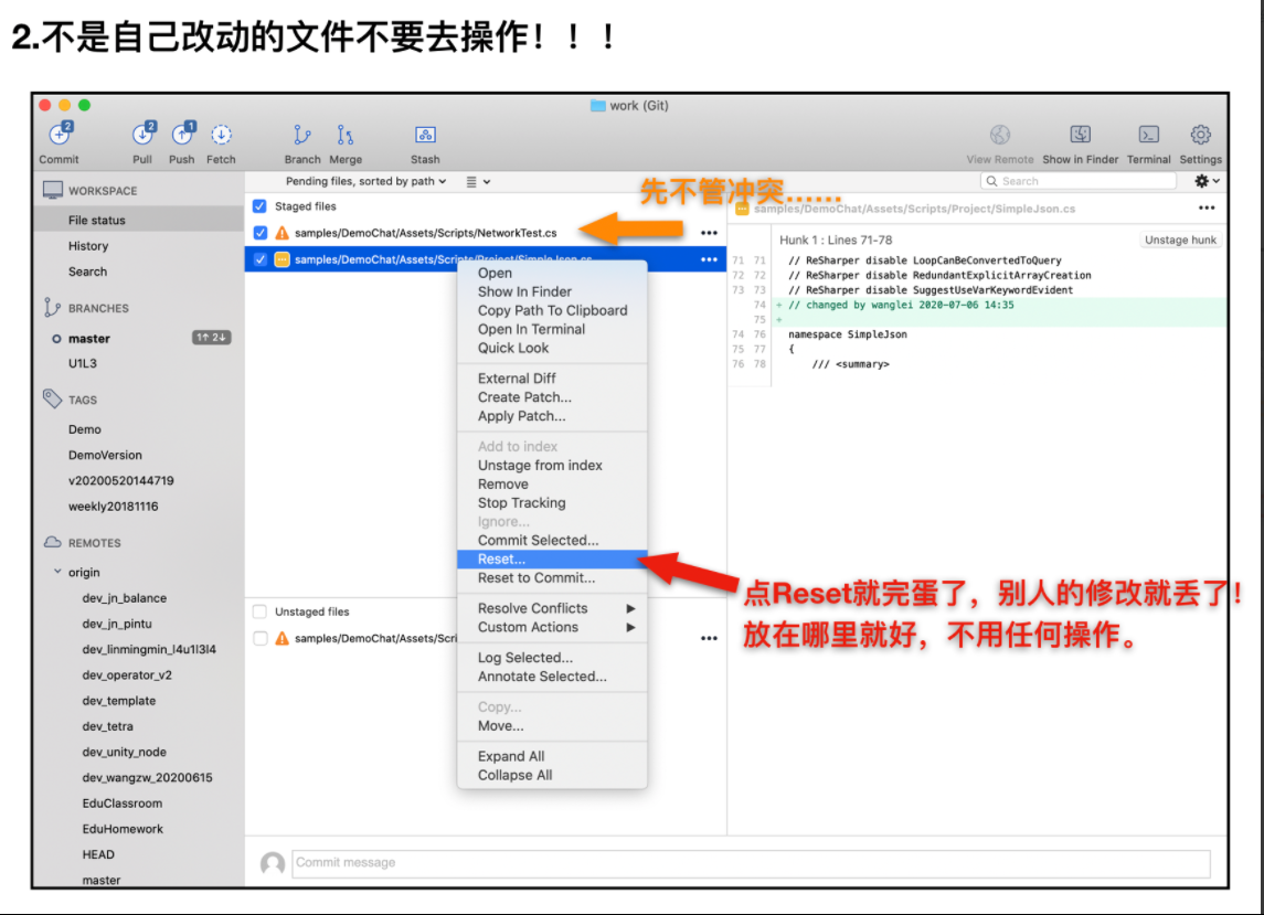 由于同学不要熟练sourcetree, 因此看到一堆更改后,很恐慌,发现又不是自己修改的代码,就把别人的场景和代码直接reset了,导致问价你丢失。