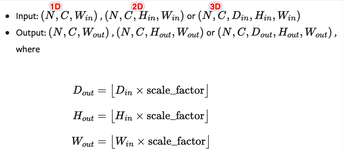 scale_factor (float or Tuple[float] or Tuple[float, float] or Tuple[float, float, float], optional) – 指定输出为输入的多少倍数。如果输入为tuple,其也要制定为tuple类型