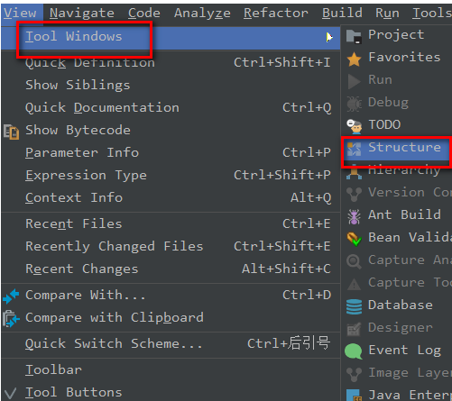 3.那么编辑完代码后我们如何查看生成的方法呢?在菜单栏点击View-->Tool Windows-->Structure,便可以看到类中所有的方法了,这些都是lombok帮我自动生成的。