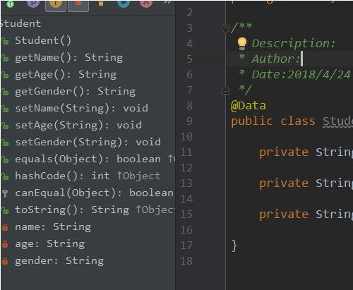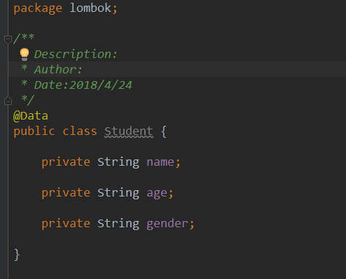 2.接下来编辑一个实体类Student,添加三个属性,最后在类上添加@Data属性,这个注解可以帮我们在.class文件中生成类中所有属性的get/set方法、equals、canEqual、hashCode、toString方法等。