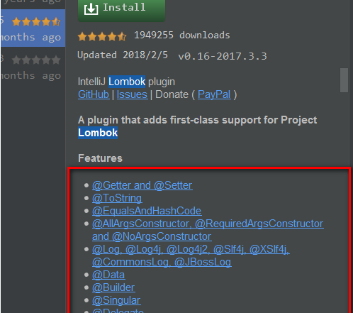 3.我们在安装页面可以看到lombok具体支持的所有注解,在安装过程中有Downloading Plugins的提示,安装过程中进度条会变化。