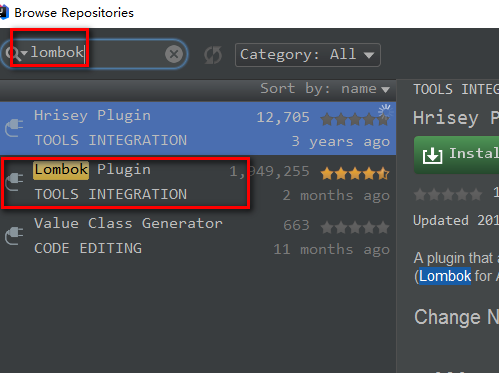 安装完成后我们再回到Plugins,此时在右侧可以搜索到lombok,而安装前是不行的。