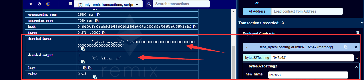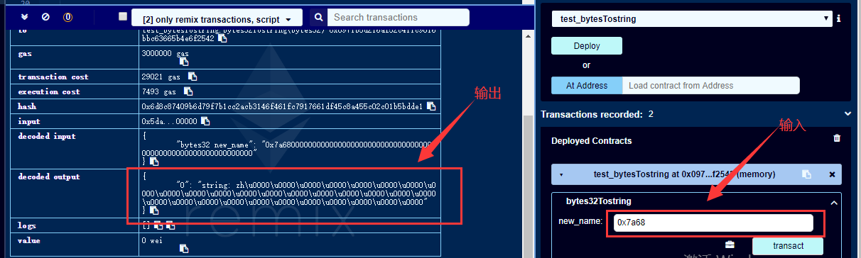 通过传入一个字节长度为32(最大可输入的字节长度为32,不一定是32位)的变量然后通过转换位一个string类型,运行结果如下: