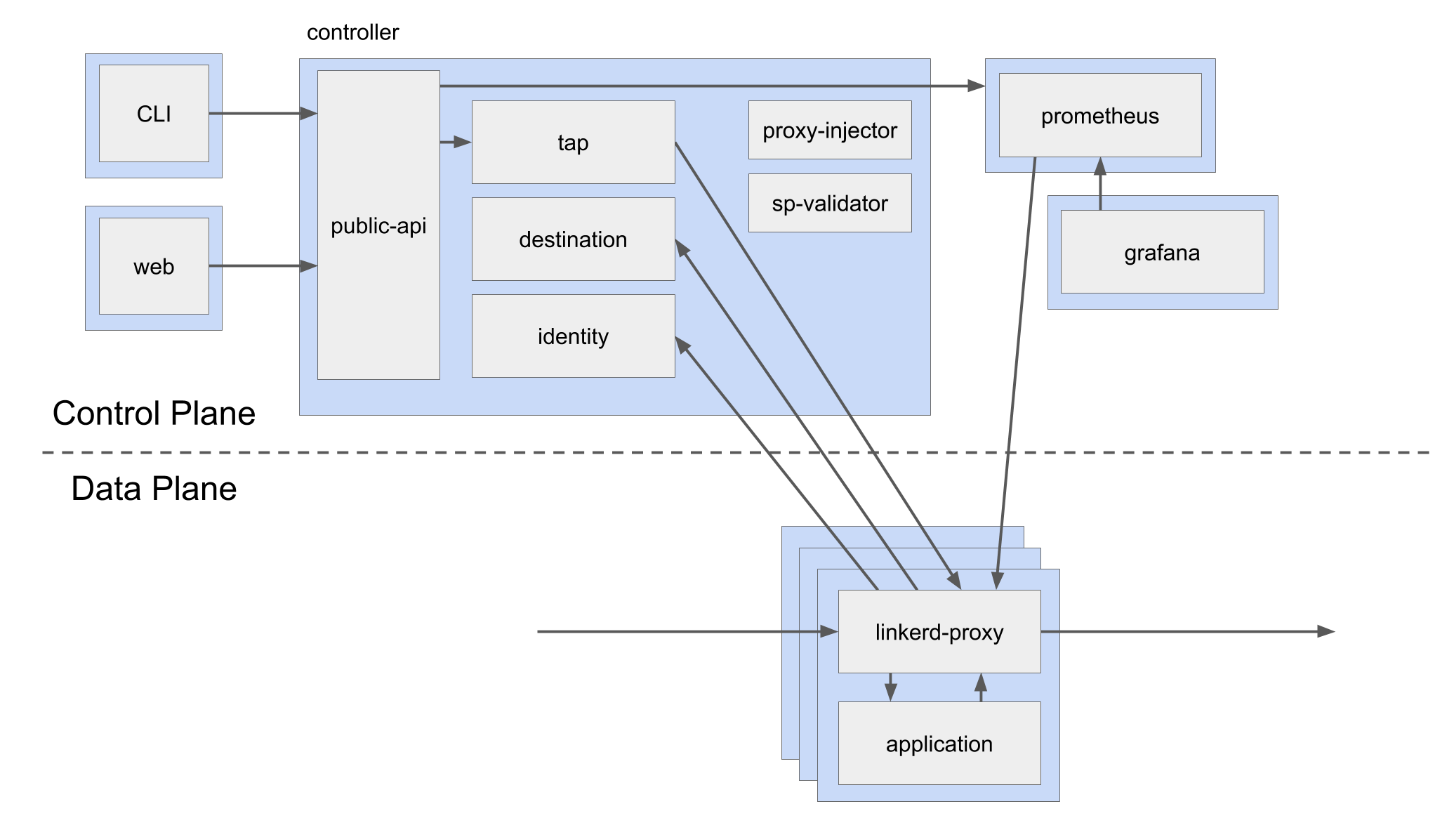 Linkerd具有三个组件(Components)-UI,数据平面(Data Plane)和控制平面(Control Plane)。它通过在每个服务实例旁边安装轻量级透明对象来工作。