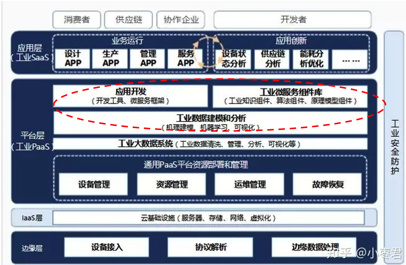 留心的看官可能已经发现,工业PaaS平台中一块用红圈标注了,这不同于下面的通用PaaS平台,不是简单的设备资产管理、运维、报警、FM等,而涉及对工业数据的业务建模和相关行业知识的服务化组件开发。这块也真是目前工业互联网迟迟难以落地成功的一个重要原因——个性化、定制化