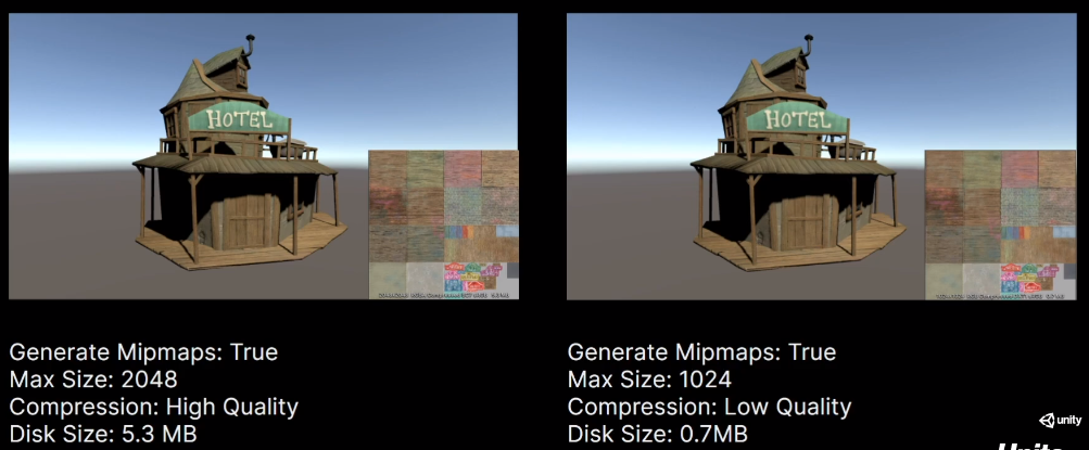 例如下图中左右两边使用的都是相同的模型与贴图,但是最终所占的磁盘大小却差了很多,就是因为一些设置导致的。