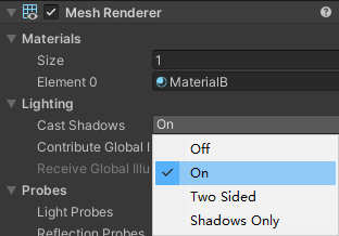默认情况下,MeshRenderder组件的Cast Shadows是开启的。