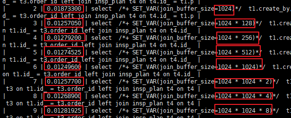 建议通过一个系统中用的比较频繁比较具有代表性(复杂程度中等或中等偏下)的SQL进行测试,将join_buffer_size的值设置成最适合该SQL的大小。通过上文中介绍的 在DML语句中设置环境变量 的方法来找上述的代表性SQL或关联表比较多的SQL最合适的join_buffer_size的取值: