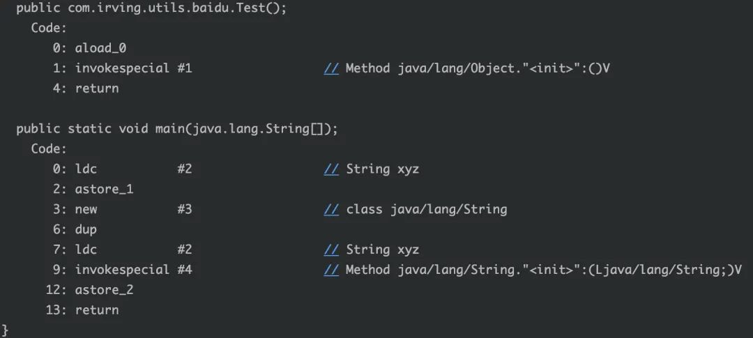 很明显,我们看到new 创建了一个String对象,同时ldc在常量池中创建了"xyz"字符串对象,之后invokespecial执行构造函数,astore_1赋值,return返回。