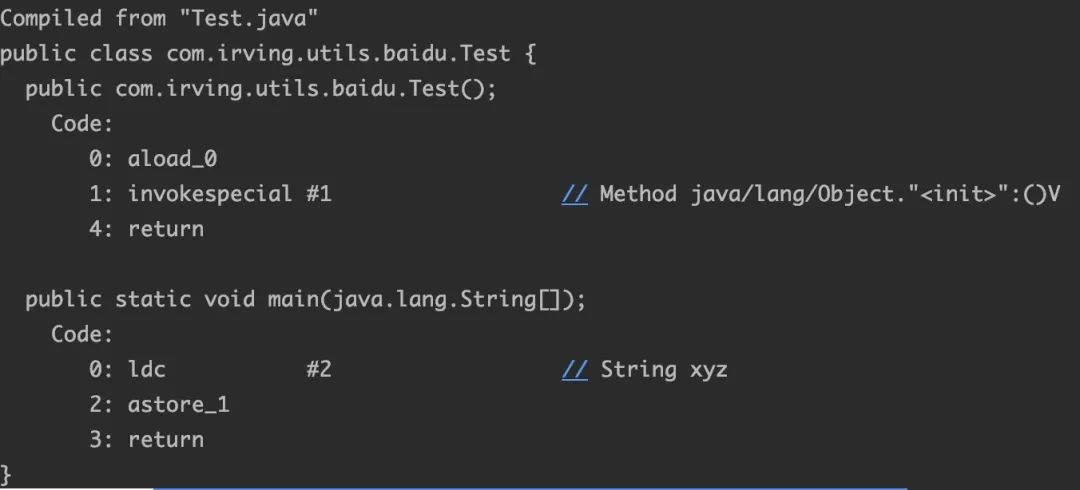 从结果来看,ldc命令在常量池中创建了一个"xyz"的对象,然后把他推至操作数栈顶,然后astore保存到局部变量,return返回。