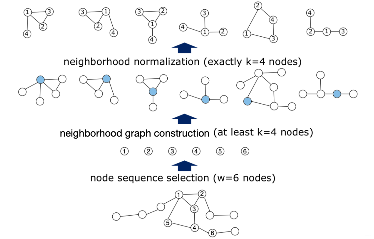 Neighborhood graph construction: Take the nodes selected in the previous step as the center. Get their neighbors (can be first-order or second-order), which form ω \omega ω cliques. Sort the neighbors in each clique according to the node ranking obtained in the previous step, and then take the first k k k neighbors and arrange them in order, that is, form ω \omega ω ordered cliques. If the number of nodes is smaller than k k k, empty nodes should be used for padding.