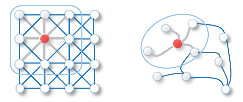Images can be considered as a special form of graph with each pixel representing a node. Each pixel is directly connected to its nearby pixels, as illustrated in the figure above (left). A filter is applied to a 3 × 3 3 \times 3 3×3 patch by taking the weighted average of pixel values of the central node and its neighbors across each channel.