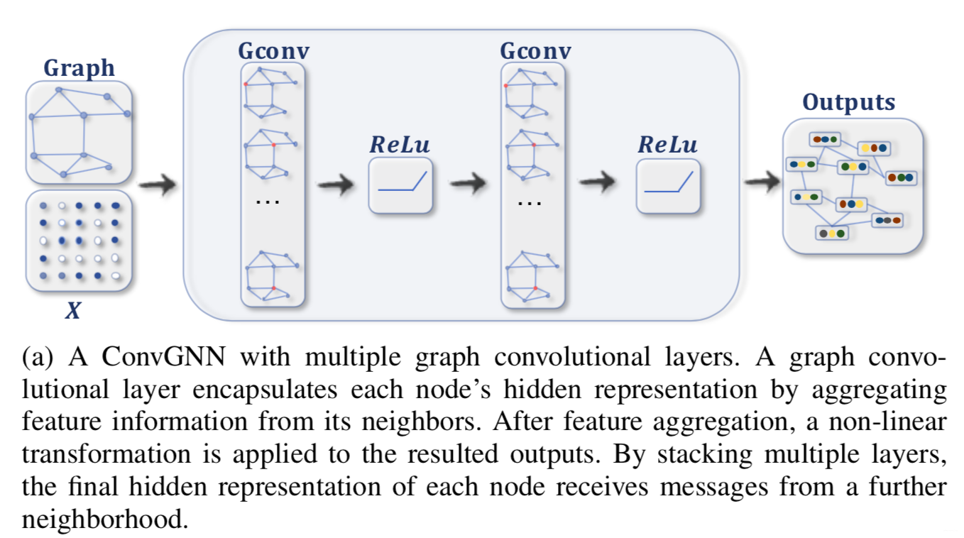 As shown in the figure above, the input of GCN is the entire graph. In each convolution layer, a convolution operation is performed on the neighbors of each node, and the center node representation is updated with the result of the convolution. Then an activation function such as ReLU is used before going through the next layer of convolution layer. The above process continues until the number of layers reaches the expected depth (a hyper-parameter).