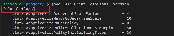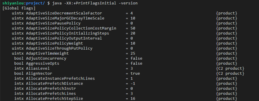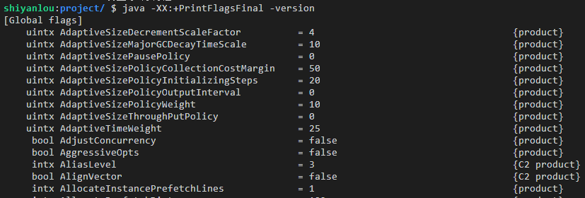 java -XX:+PrintFlagsFinal -version