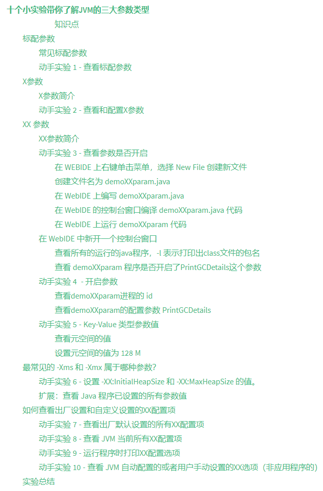 本节实验课学习了如何查看基本参数、X参数、XX参数和设置XX参数。以及用好jps和jinfo工具来查看进程和设置参数。
