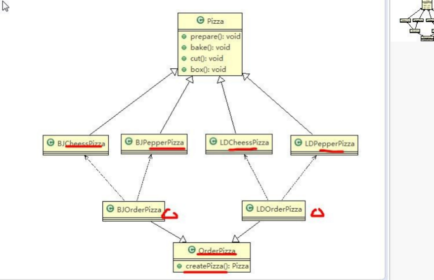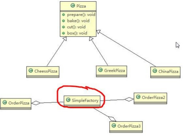 - 思路:把创建 Pizza 对象封装到一个类中,这样我们有新的 Pizza 种类时,只需要修改该类就可,其它有创建到 Pizza 对象的代码就不需要修改了 -> 简单工厂模式