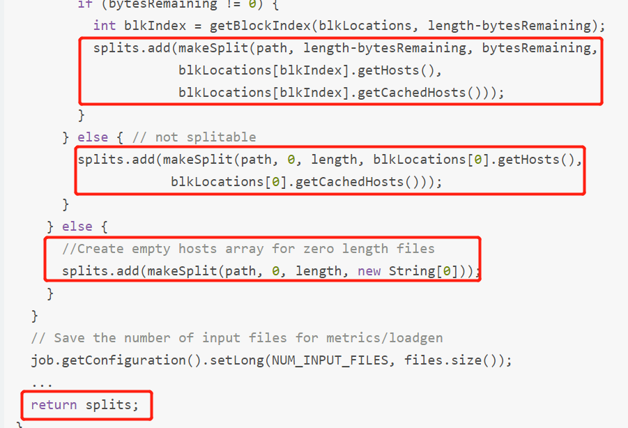 getSplits主要是将files进行切片,将文件路径path、偏移量(即起始位置,是该split在整个文件中的起始位置)、切分大小splitSize、偏移量所在block的locations信息Host和在内存中的host信息写入FileSplit对象中,一个split对应一个对象,最后放入splits中返回。