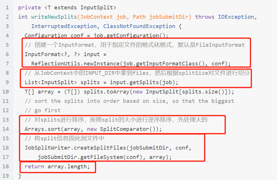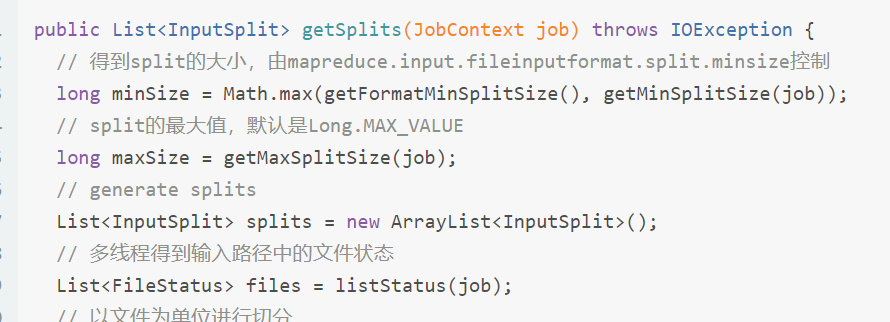 - 创建InputFormat实例,用实例调用getSplits方法对文件进行切分,getSplits内部是切分的主要逻辑;
