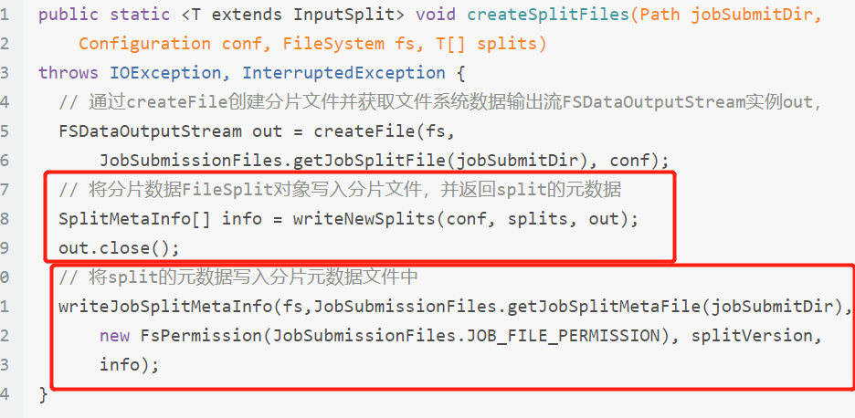 createSplitFiles创建的文件包括两个,分别是记录切片的切片文件和记录切片元数据的切片元数据文件 。