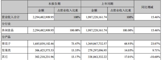 葵花子类产品实现收入16.86亿元,同比增长23.07%,占总营收比重73.47%,实现了33.09%的毛利率;