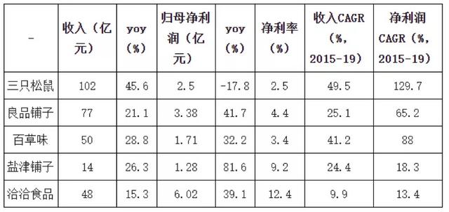 主要休闲食品公司2019年收入、归母净利润以及2015-19年CAGR: