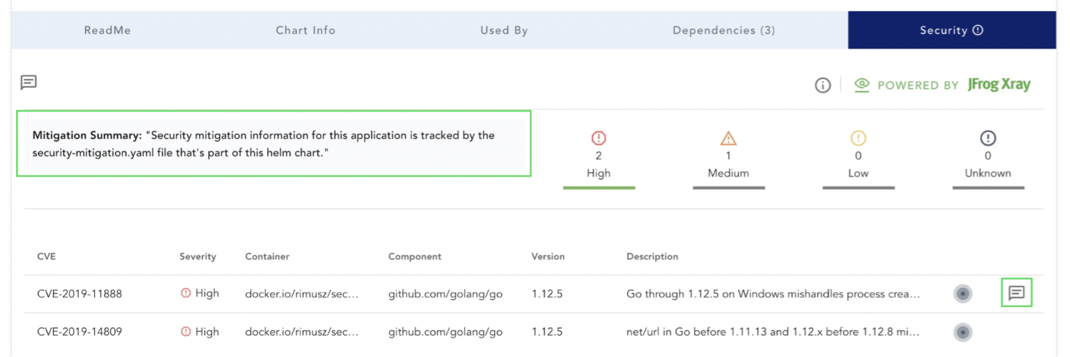 例如,以下的security-mitigation.yaml文件为Helm Chart rimusz/security-sample-chart提供了摘要和单独的CVE减轻信息: