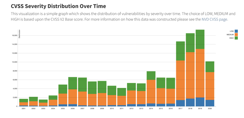 在美国国家漏洞数据库(NVD)中,通过公共常见漏洞和暴露(CVE)列表展示了很多容器镜像中发现的安全漏洞。随着容器和K8s的广泛引用,我们发现,容器相关的漏洞和风险不但没有下降,在NVD上注册的CVE的数量和严重性反而急剧地增加,如下图所示: