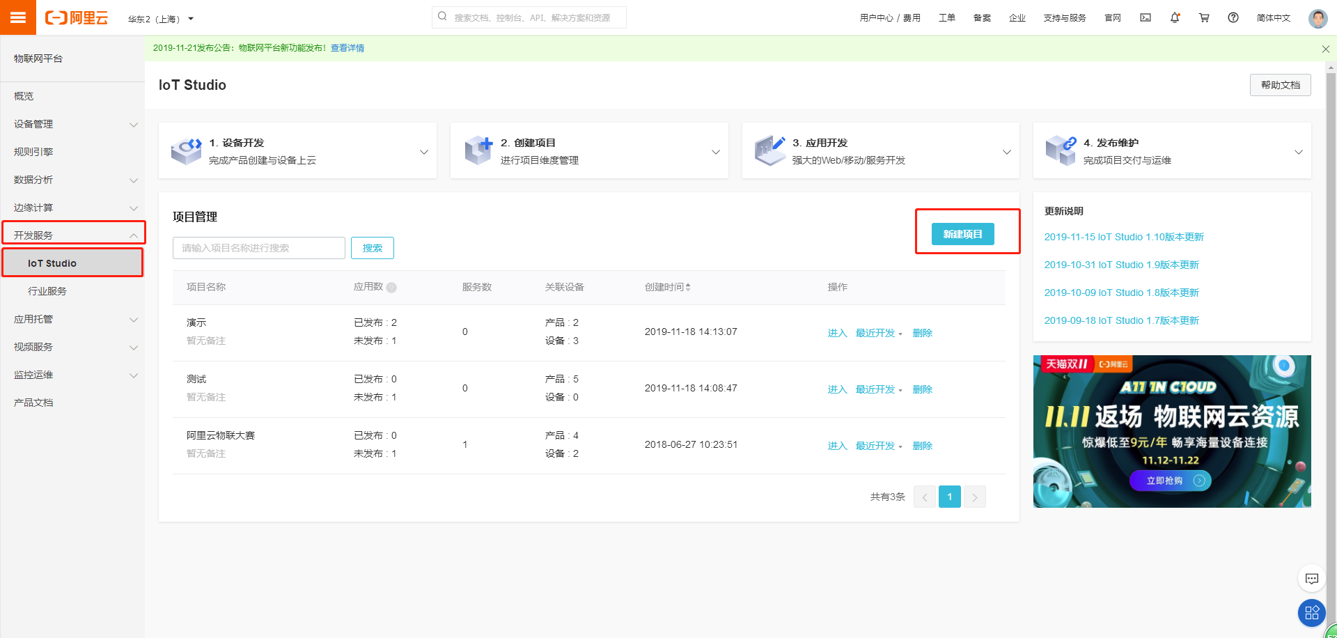 首先进入物联网平台,打开开发者服务,选择IoT Studio,然后点击新建项目。