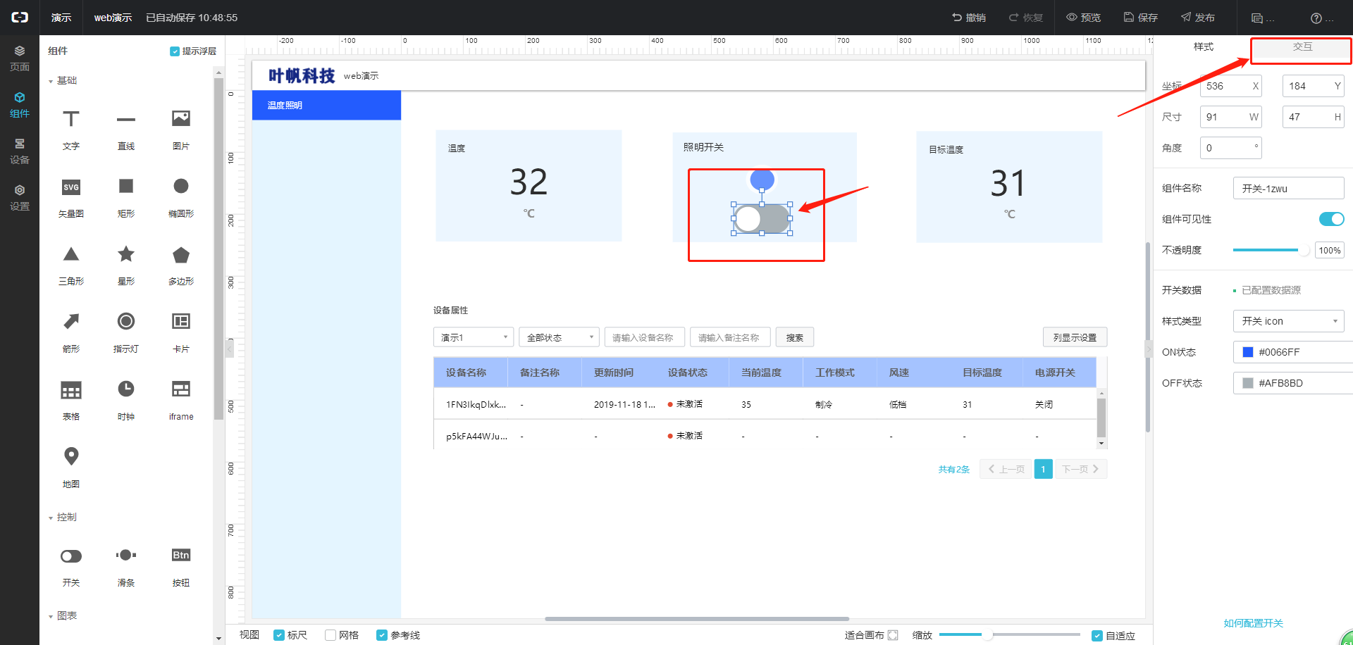 然后点击视图页面中的控件,左边导航栏就会显示相应控件的配置信息,可以改变控件样式,以及在交互选项中配置控件与那个设备关联