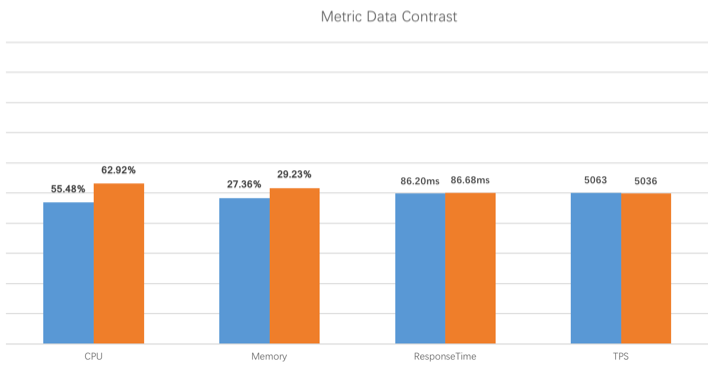 图中蓝色代表未使用 SkyWalking 的表现,橙色代表使用了 SkyWalking 的表现,以上是在 TPS 为 5000 的情况下测出的数据,可以看出,不论是 CPU,内存,还是响应时间,使用 SkyWalking 带来的性能损耗几乎可以忽略不计。