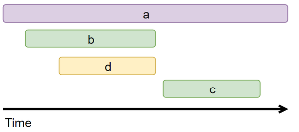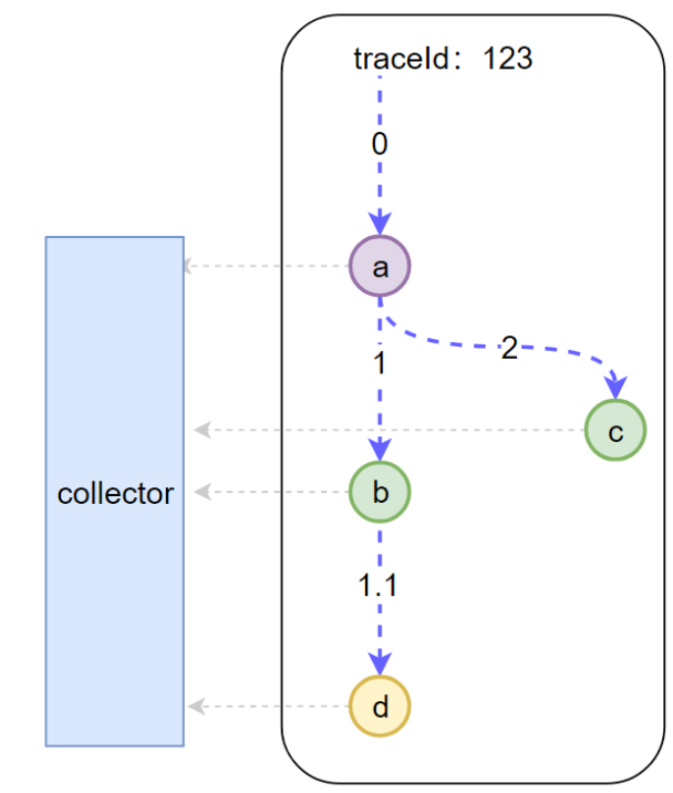parent_span_id:比如 b 调用 d 的 span_id 是 1.1,那么它的 parent_span_id 即为 a 调用 b 的 span_id 即 1,这样才能把两个紧邻的调用关联起来。