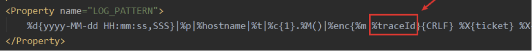 我们用的是 log4j,这里就要了解一下 log4j 的插件机制了,log4j 允许我们自定义插件来输出日志的格式,首先我们需要定义日志的格式,在自定义的日志格式中嵌入 %traceId, 作为占位符,如下: