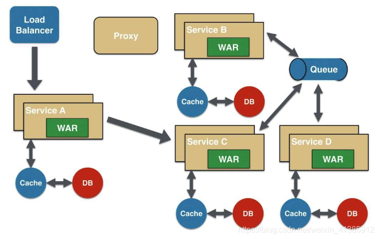 在单体架构中由于所有的服务,组件都在一台机器上,所以相对来说这些监控指标比较容易实现,不过随着业务的快速发展,单体架构必然会朝微服务架构发展,如下: