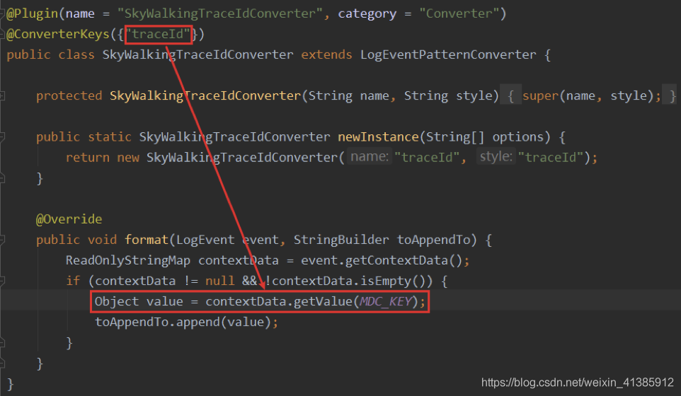 首先 log4j 的插件要定义一个类,这个类要继承 LogEventPatternConverter 这个类,并且用标准 Plugin 将其自身声明为 Plugin,通过 @ConverterKeys 这个注解指定了要替换的占位符,然后在 format 方法里将其替换掉。