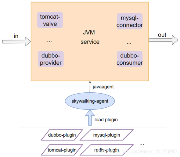 SkyWalking 采用了插件化 + javaagent 的形式来实现了 span 数据的自动采集,这样可以做到对代码的 无侵入性,插件化意味着可插拔,扩展性好(后文会介绍如何定义自己的插件)。