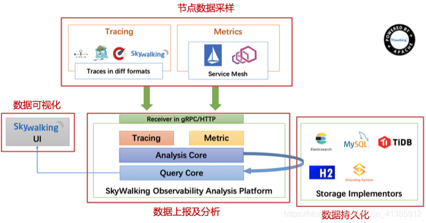 SkyWalking 的基础如下架构,可以说几乎所有的的分布式调用都是由以下几个组件组成的。