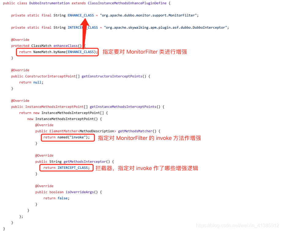所以显然我们需要在插件中指定我们要增强的类(MonitorFilter),对其方法(invoke)做增强,要对这个方法做哪些增强呢,这就是拦截器(Inteceptor)要做的事,来看看 Dubbo 插件中的 instrumentation(DubboInstrumentation)。