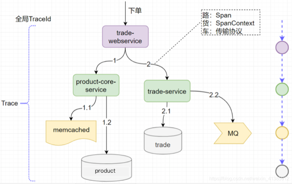 如图示,一次下单的完整请求完整就是一个 Trace, 显然对于这个请求来说,必须要有一个全局标识来标识这一个请求,每一次调用就称为一个 Span,每一次调用都要带上全局的 TraceId, 这样才可把全局 TraceId 与每个调用关联起来,这个 TraceId 就是通过 SpanContext 传输的,既然要传输显然都要遵循协议来调用。