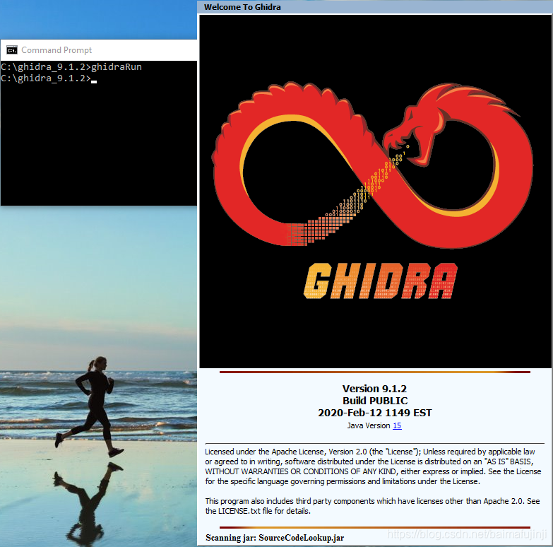 现在打开Windows的命令行程序,切换到Ghidra的安装目录,并输入ghidraRun,程序就被启动了,如下图所示: