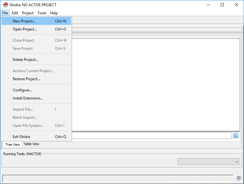 在File菜单中选择新建一个项目(如下图所示),然后在弹出的对话框中选择“Non-Shared Project”,并按【Next>>】按钮。再选择项目的保存路径,并给新项目命名(我这里使用的名称是demo_proj,你会在接下来的示例截图中看到这个名字),然后点击【Finish】按钮,就成功创建了我们的第一个Ghidra项目了。