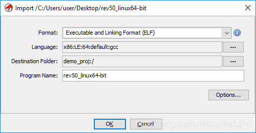 在新弹出的对话框中,为了让Ghidra更好地解析你的二进制文件,这里你可以选择项目的格式(例如ELF)以及使用的编译器等等。就目前的这个项目来说,Ghidra自动检测到的结果是比较合适的,所以此处可以使用默认选项,然后单击【OK】按钮。
